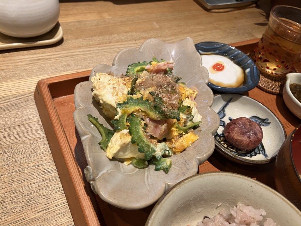 メインは曜日替わりで、人参しりしりやゴーヤーチャンプルー、麩を使ったチャンプルーなど、沖縄の家庭料理が中心。この日は一番人気というゴーヤーチャンプルーを選びました。
