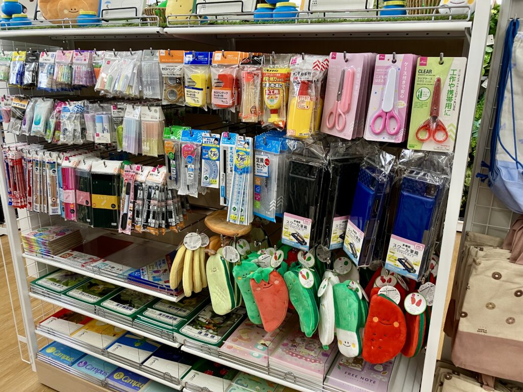 入園・入学・進級に向けたネーム用品、巾着、文具、収納用品などがまとまって並び、必要なものを一度に揃えやすい環境でした。子育て世代にとっては、「まとめて準備できる」安心感があります。