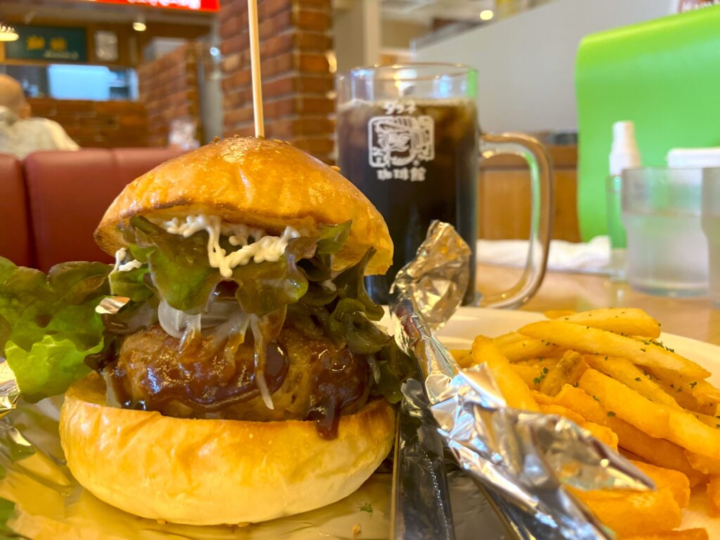 今回は軽めのブランチとしてハンバーガーセット(+450円)も注文。厚みのあるパティと香ばしいバンズ、揚げたてポテト、ジョッキで提供されるアイスコーヒーで、休日の朝をゆっくり楽しめました。