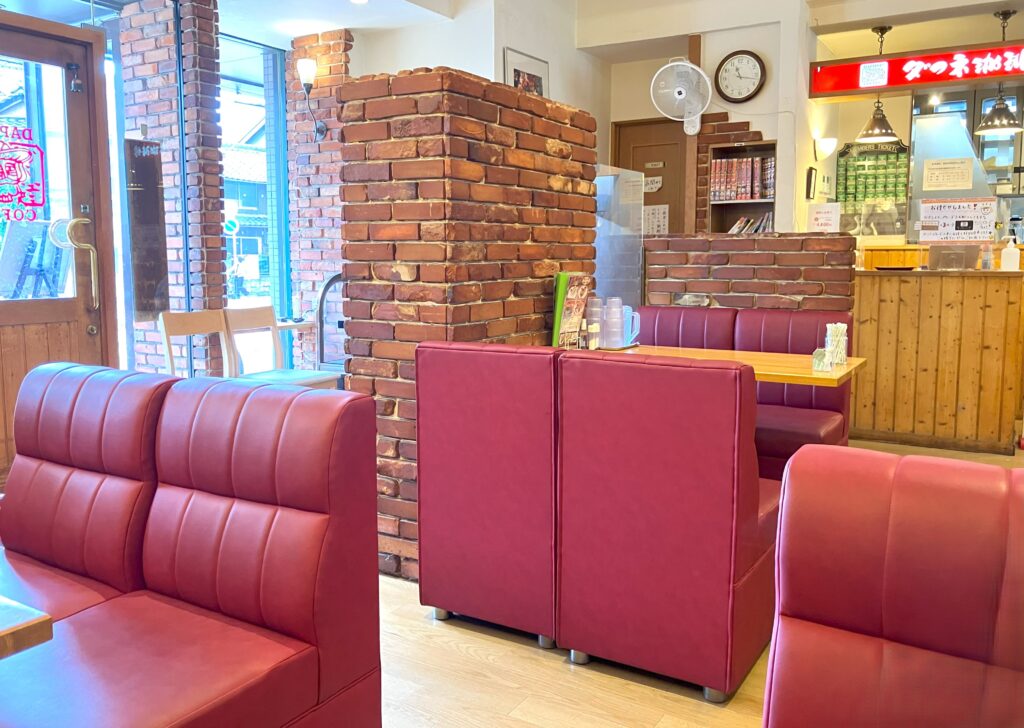 煉瓦と木を基調にしたロッジ風の内装に、赤いソファ席。初めてでも不思議と落ち着く空間です。新聞や雑誌を手にくつろぐ常連さんの姿も多く、普段着のままふらっと立ち寄れる“日常の延長”が感じられます。