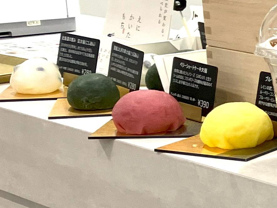 ショーケースには、こしあんと黒豆の豆大福、つぶあんとよもぎの草大福といった定番商品に加え、パティシエが考案したというスイーツ大福も並びます。