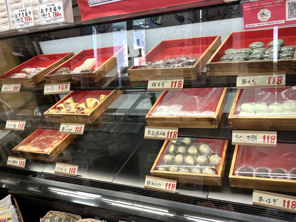 店内に入ると、ショーケースには看板商品のあずき最中をはじめ、草餅、おはぎ、麩まんじゅうなど、10種類以上の生菓子が並びます。