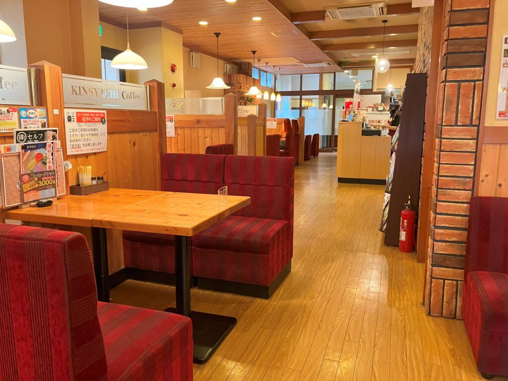 店内はウッディーな内装に、えんじ色のソファ。80席以上と席数が多く、通路も広め。コメダ同様、ゆったり過ごすのにぴったりです。