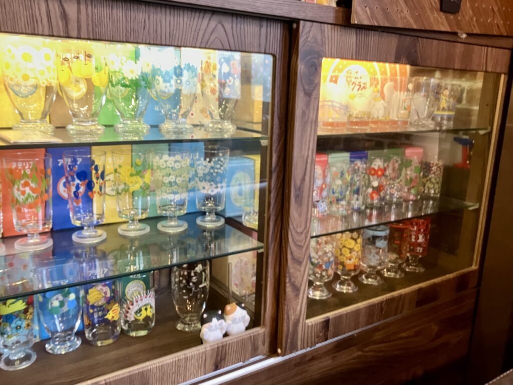 アイスドリンクを注文すると、60種類以上あるアデリアレトロのグラスの中から好きな柄を選べます。