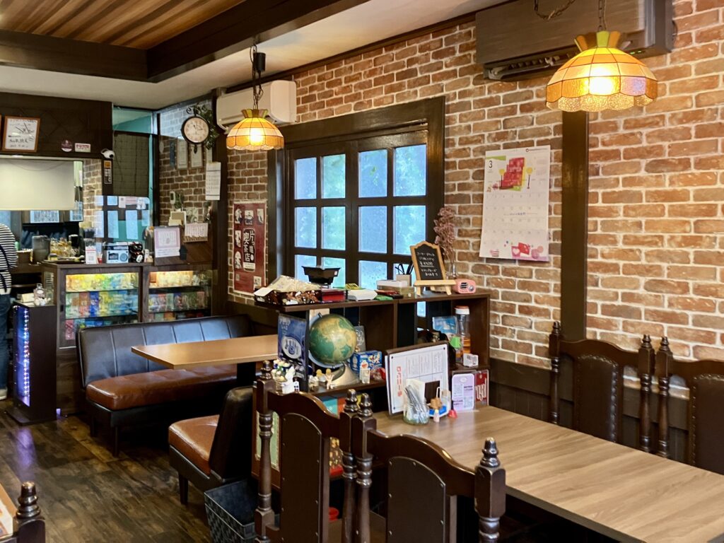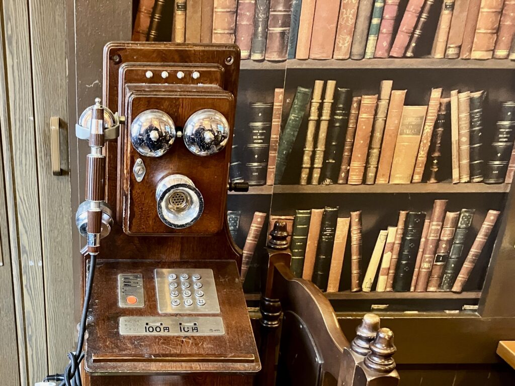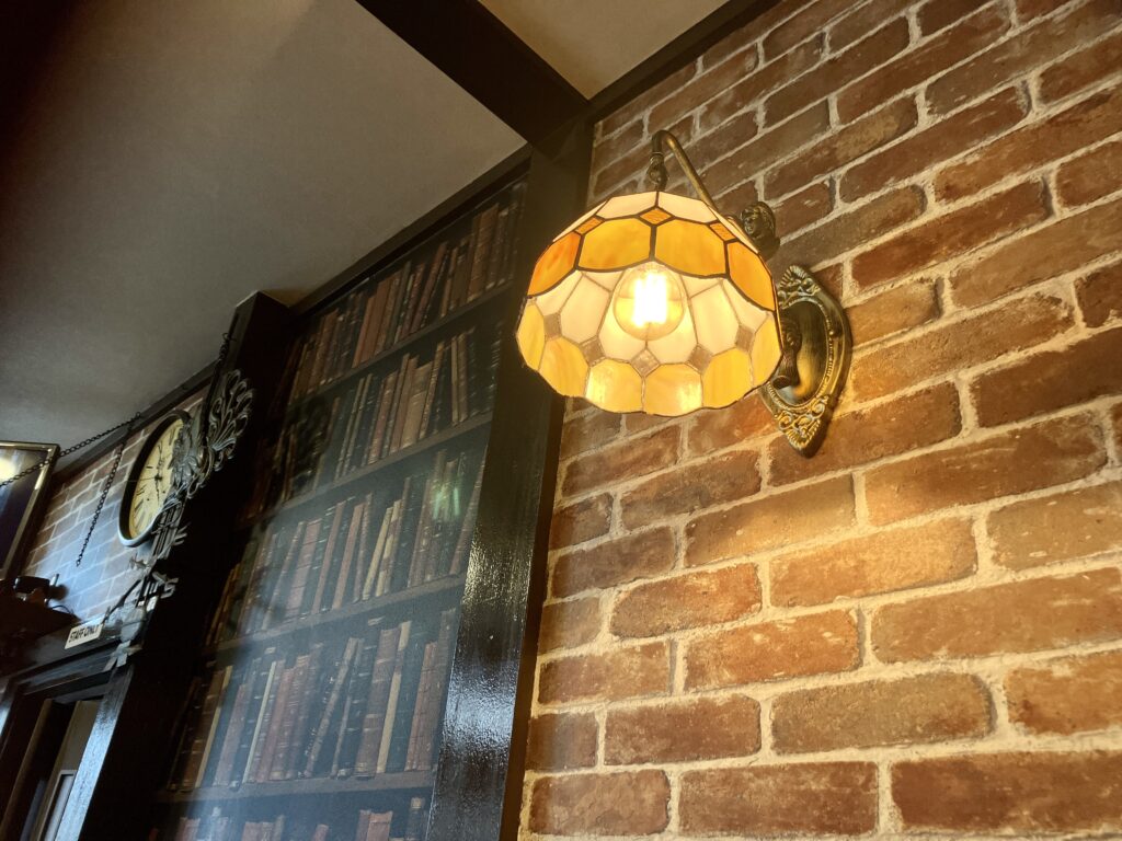 店内にはアンティーク風の椅子やステンドグラスのライト、木製電話機、本棚風の壁紙など、店主さんのこだわりが丁寧に並んでいます。