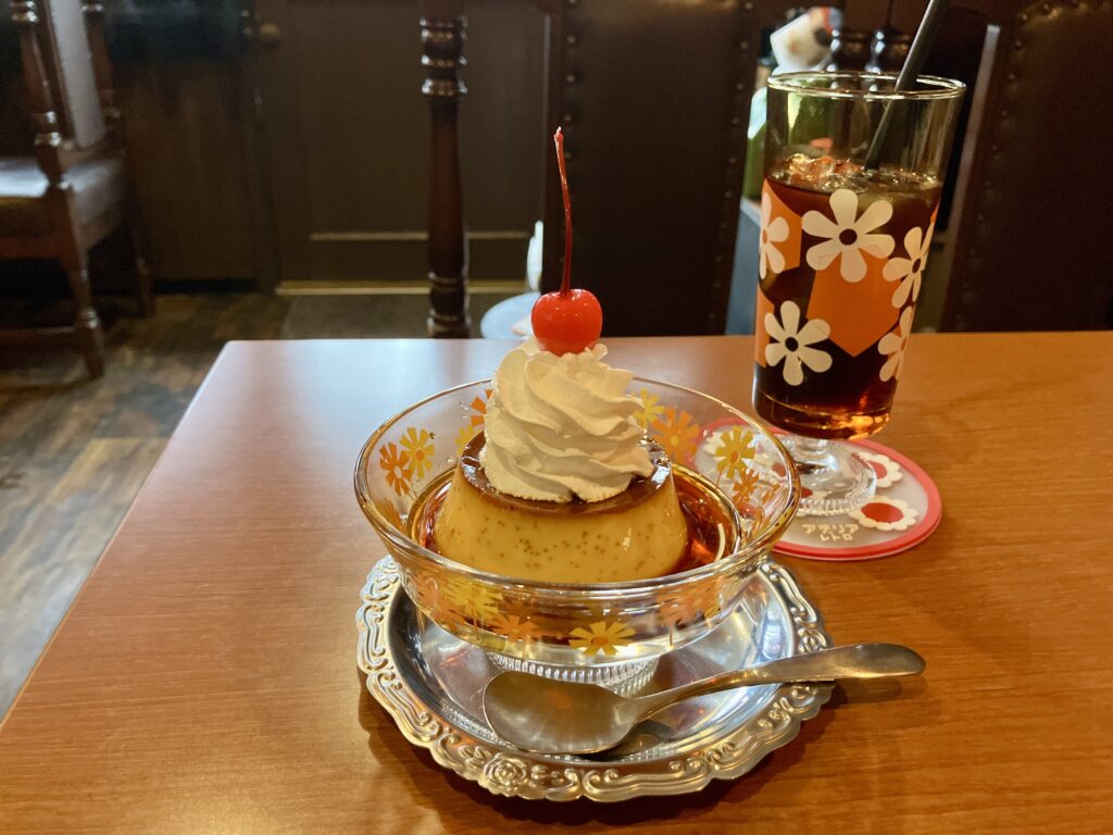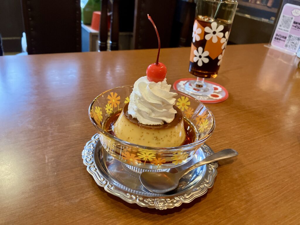 モーニングのあとにいただいた「手作り蒸しプリン」(450円)は、どこか昔の喫茶店を思わせる王道のビジュアル。