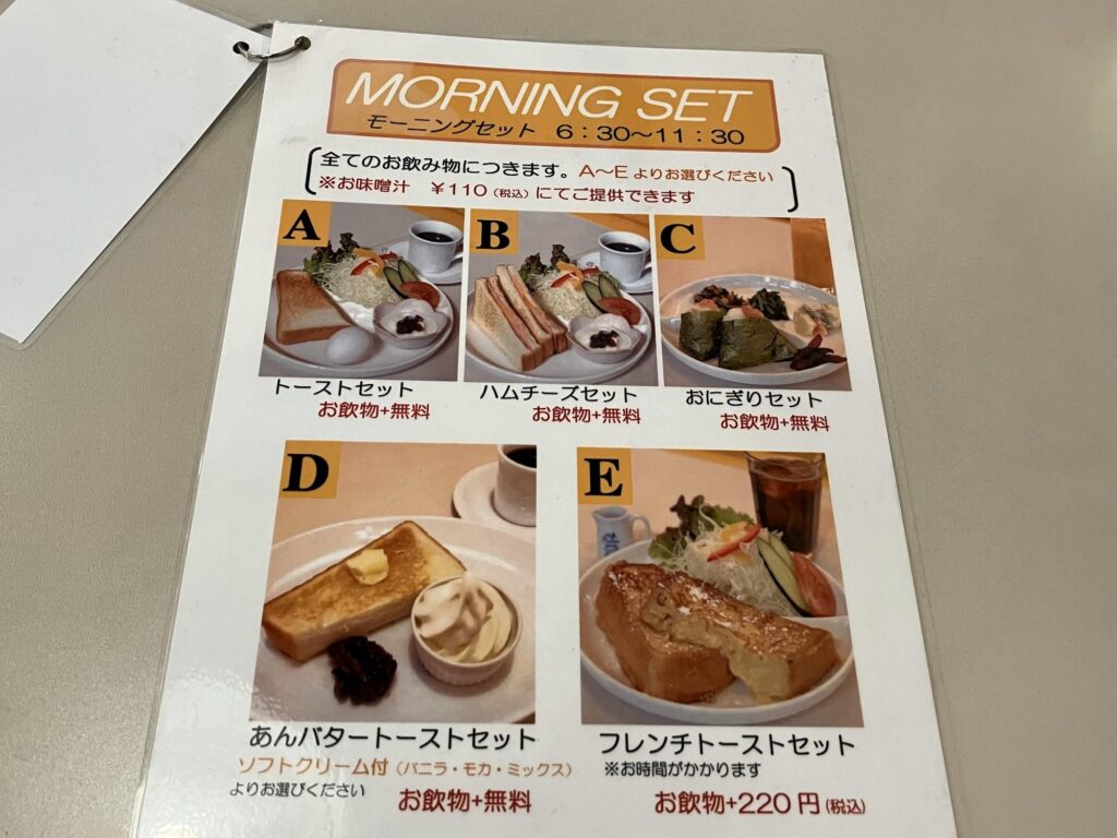 喫茶Kのモーニングは、ドリンク代のみでいただけるメニューが5種類。