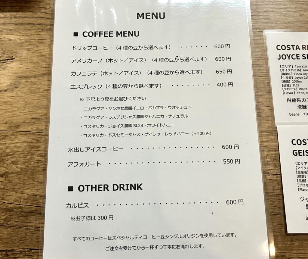現時点ではドリップコーヒーやアメリカーノ、カフェラテ、エスプレッソなど4種の豆から選べる本格派メニューのほか、水出しアイスコーヒー、アフォガードなども用意。