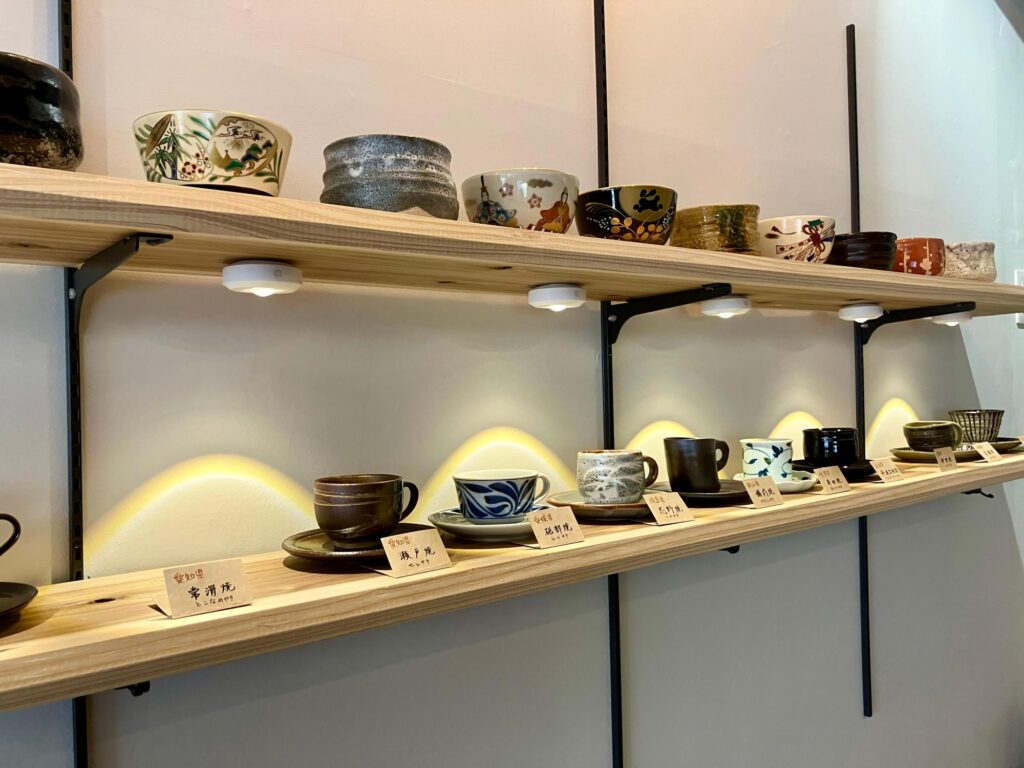 壁一面には、常滑焼、備前焼、瀬戸焼、美濃焼などの器が並びます。