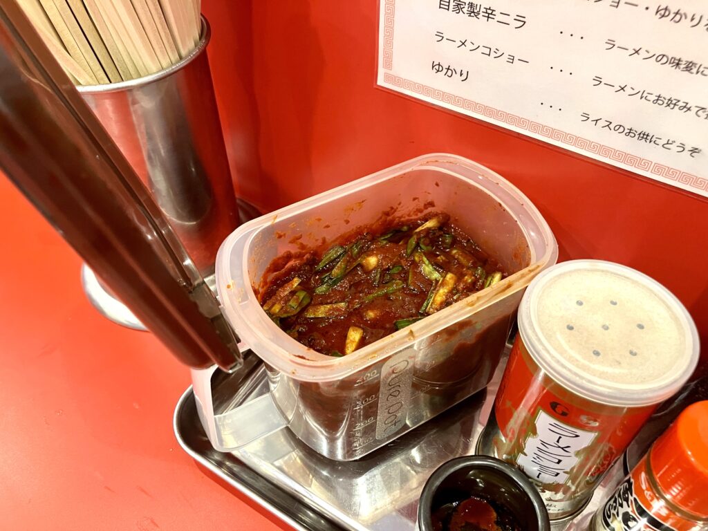 席には、ラーメンコショウや一味のほかに、この店の名物ともいえる自家製辛ニラ、そしてライスにかけるゆかりが置かれています。