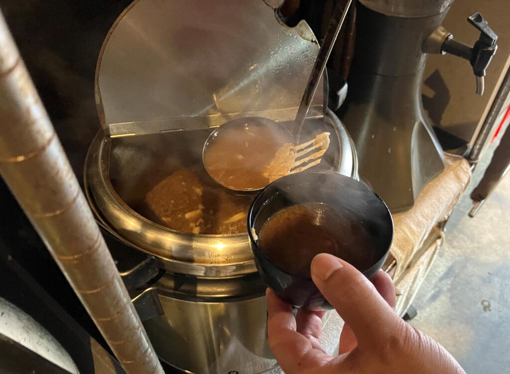 あら汁は、フロアに設置された鍋に入っているものを、セルフサービスで。(ちょっと通路が狭いので、他のお客様とぶつからないようにご注意を。)