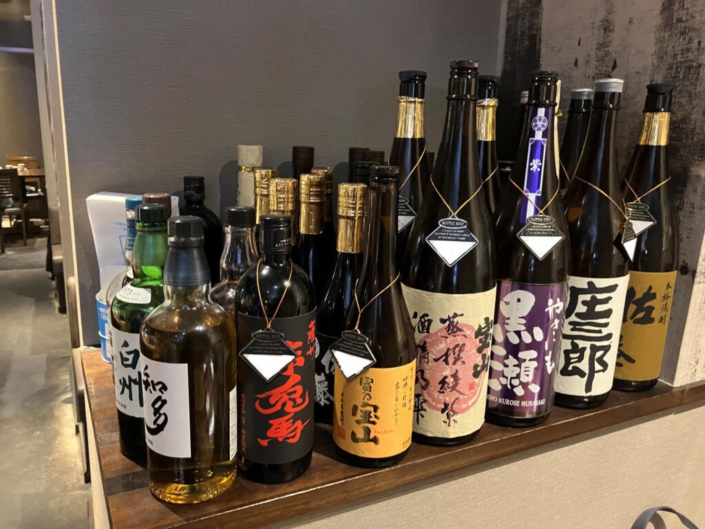 珍しい日本酒や焼酎などが並んでおり。キープボトルもちらほら。