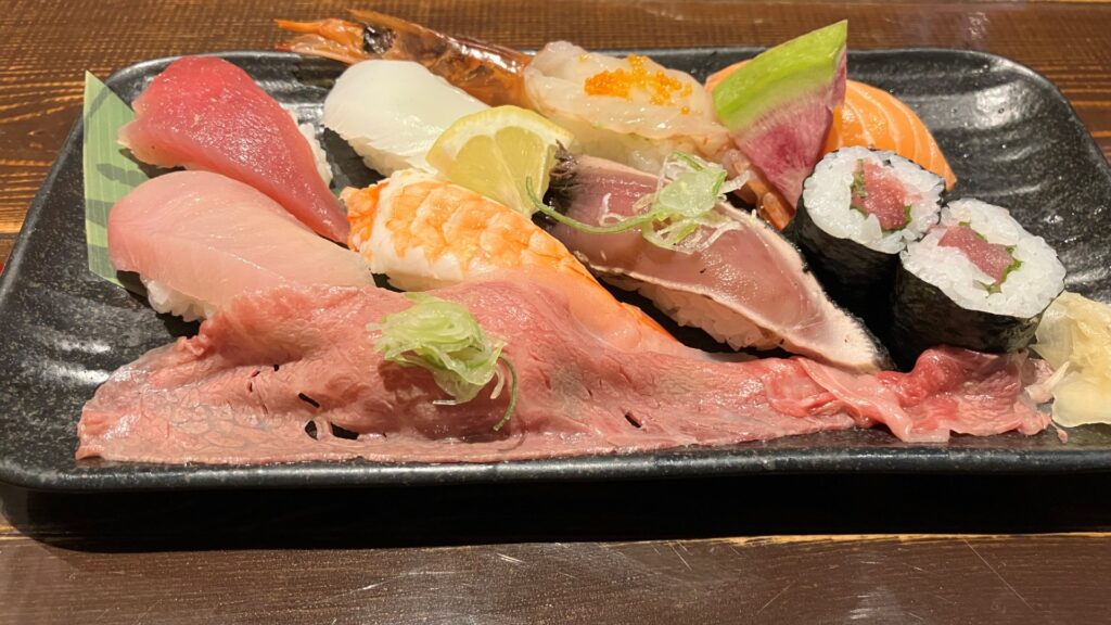 にぎりは、マグロ・イカ・海老・サーモン・鉄火・はまち・飛騨牛と充実のラインナップ。