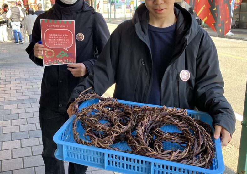 私も、北高生たちが学校の近くの畑で育てた味鋺いものつるで作ったリースと物々交換してもらいました。