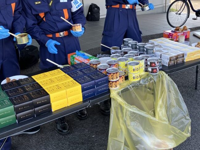 会場には缶詰などの備蓄品も並んでいて、「日常でも食べられるものをローリングストックで回しておくと安心だな」