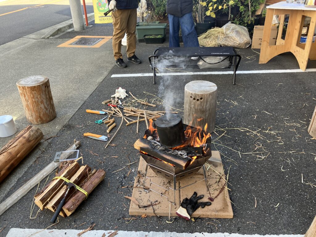 株式会社醍醐の駐車場では焚き火が行われ、松ぼっくりや桑の木を使った炭づくりの実演がありました。