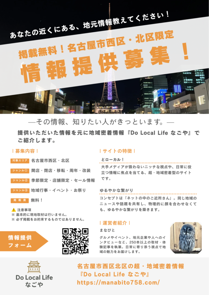 「Do Local Life なごや」では、名古屋市西区、北区とその周辺を中心に、飲食店、イベント、遊び場、施設、暮らしの情報など、地域の住民の方へ向けたお役立ち情報を広く募集しております。