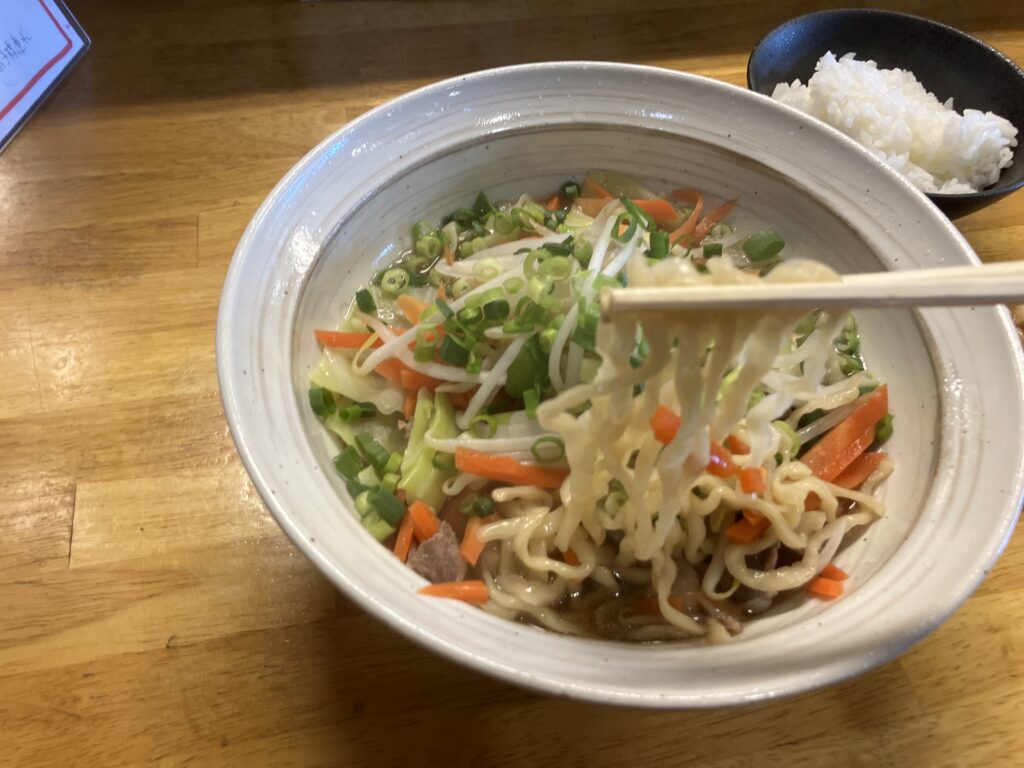 中太の縮れ麺に、自家製スープがよく絡み、シャキシャキとした野菜の食感も印象的。