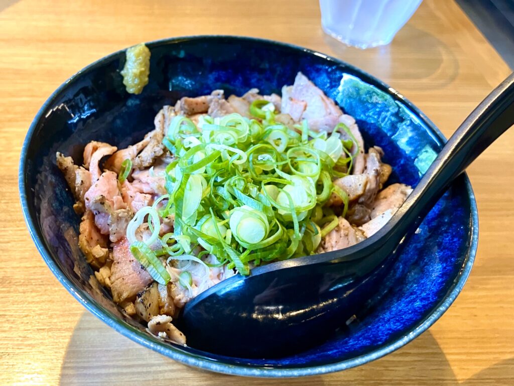 低温調理のチャーシューはしっとり柔らかく、細かく刻まれてご飯とよくなじみます。
