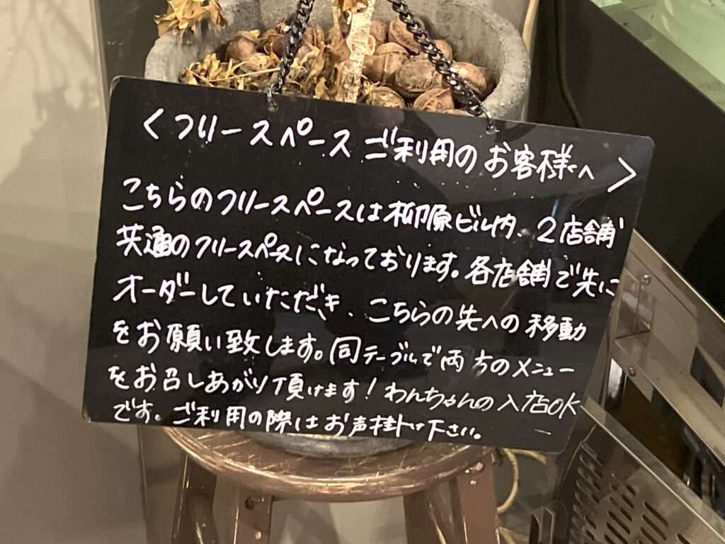 店舗横にはビルの共用フリースペースが設けられており、テイクアウトした商品をその場で楽しめる造りになっていました。