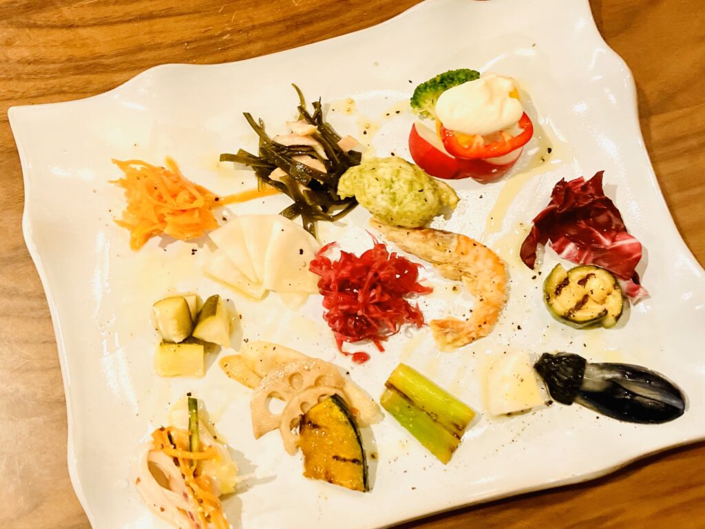 シイタケの佃煮入りクリームチーズや、ウナギの肝を使ったイタリアンソテーなど、和の食材や調味料を取り入れた一皿が並ぶのが特徴です。