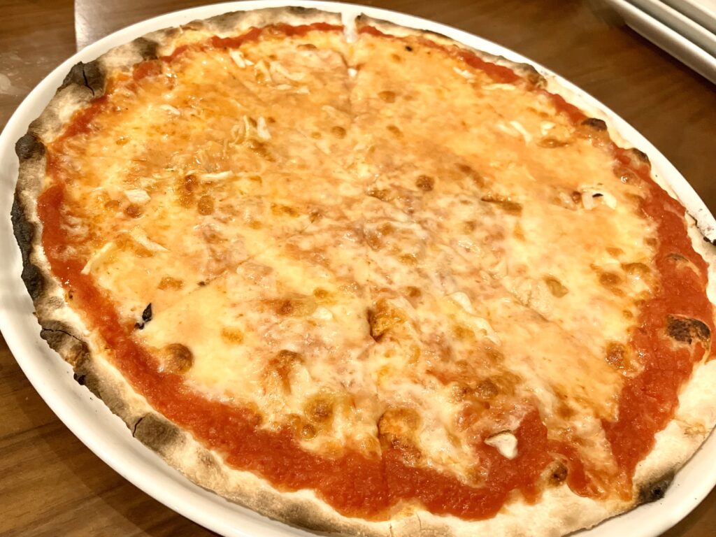 ピッツアは薄焼きのクリスピー生地で、ガーリックの香りとチーズのコクが印象的。