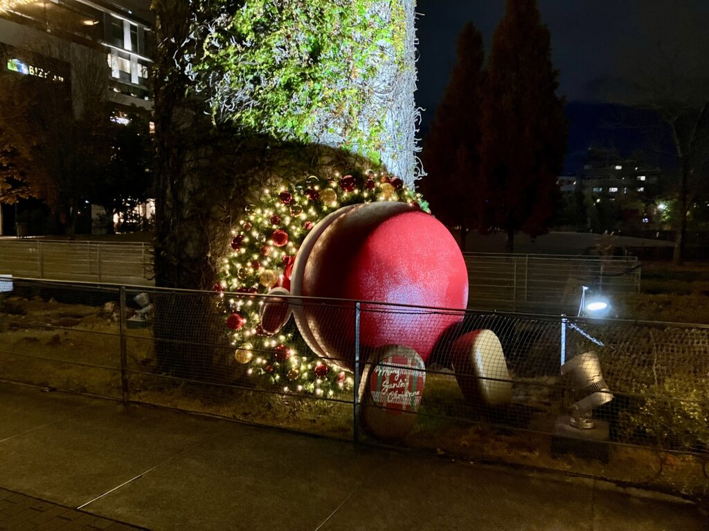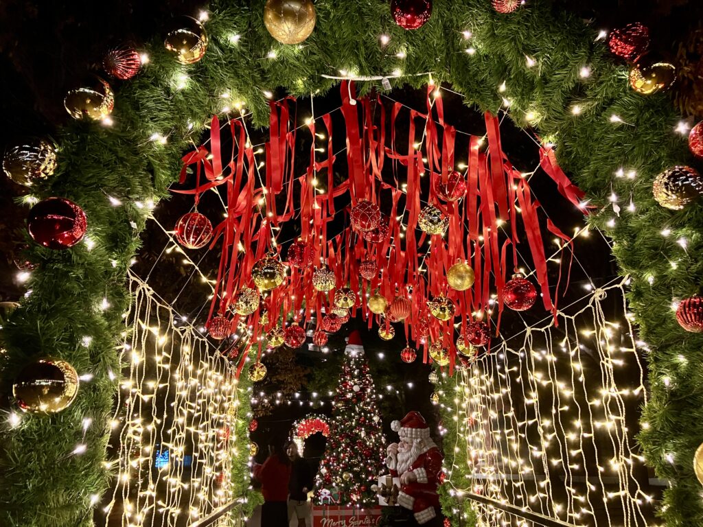 クリスマスシーズンの今は、電球でかたどられたツリーやリースが飾られ、昼間とは違う表情に。