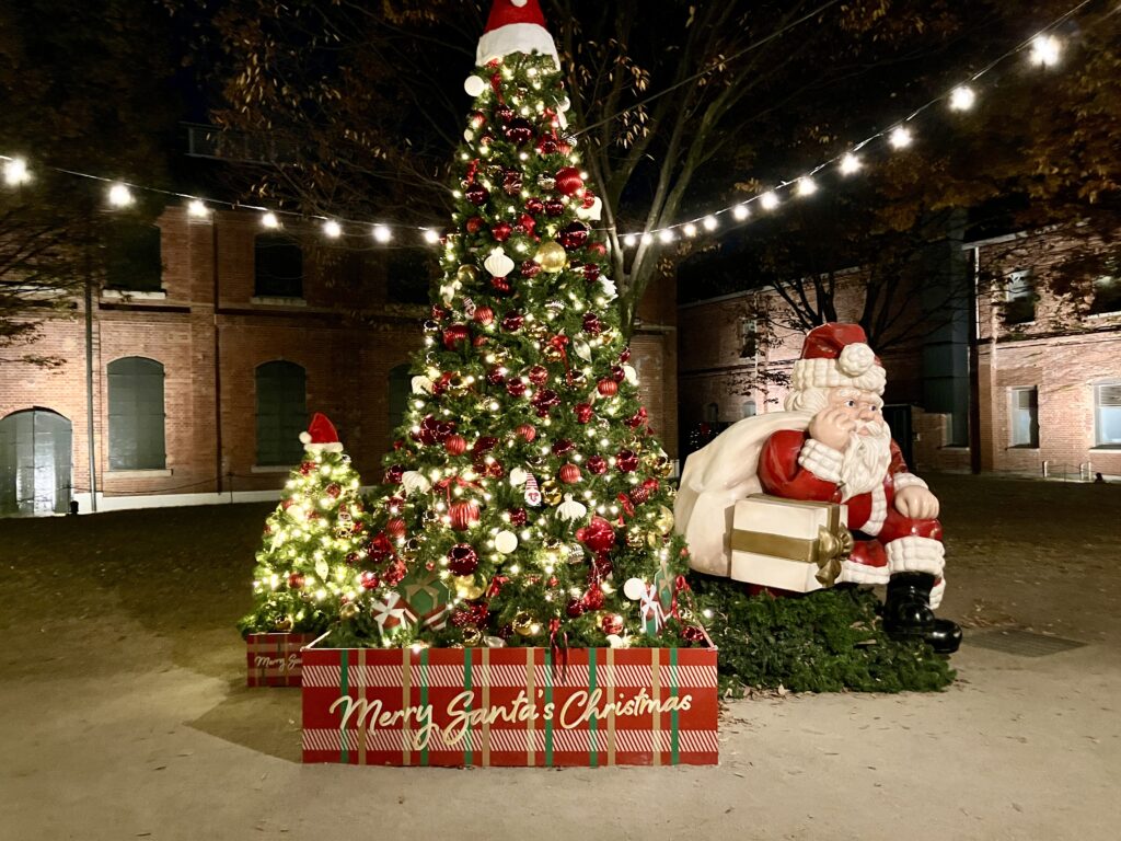 赤レンガの建物を背景にしたツリーとサンタの装飾は特に人気で、週末には撮影の順番待ちができることも。