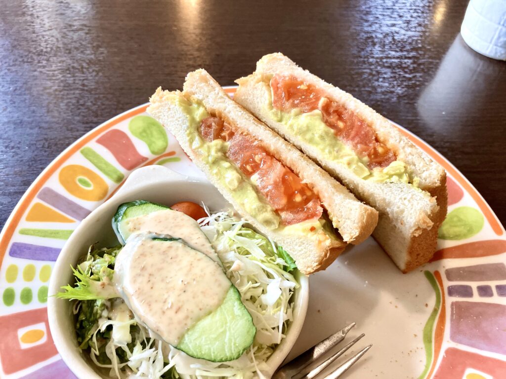 トースト2枚で、玉ねぎやトマト、ワカモレソースを挟んだ一品で、