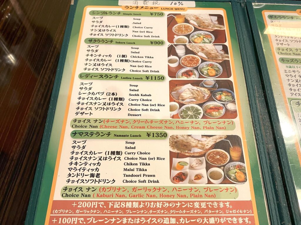 レディースランチ以上では、プレーンナンのほか、チーズナンやハニーナンなどを選べるのも特徴で、その日の気分に合わせた楽しみ方ができます。