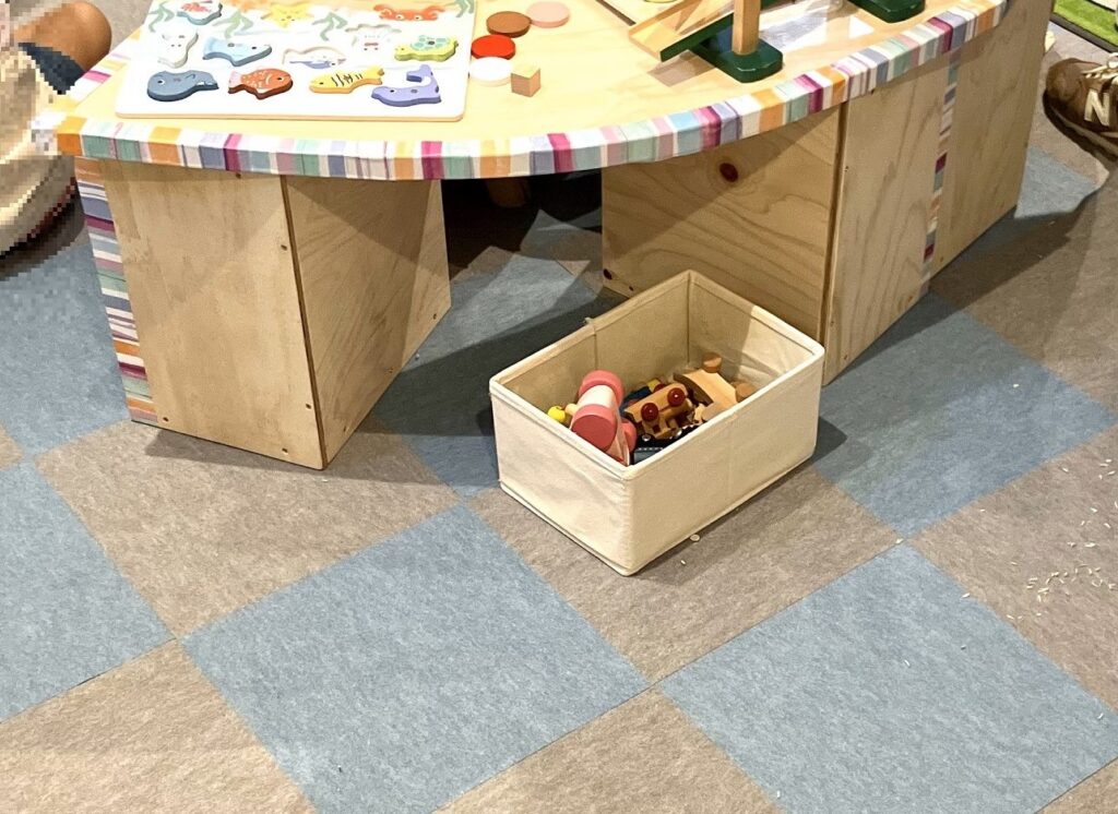 店内の床はもともとコンクリート打ちっぱなしですが、フロアマットが敷き詰められています。土足でOK、ベビーカーでもそのまま入れます。