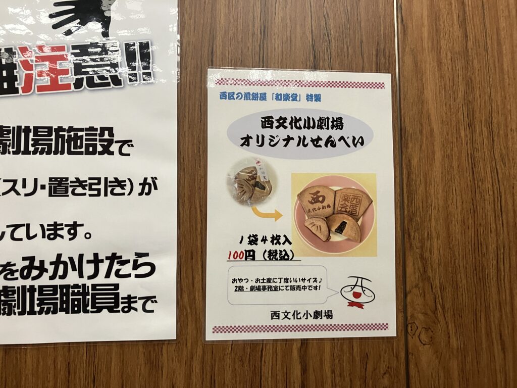 わたしがこちらを訪れるとき、ちょっと楽しみにしているのが西文化小劇場のオリジナル手焼きせんべい。