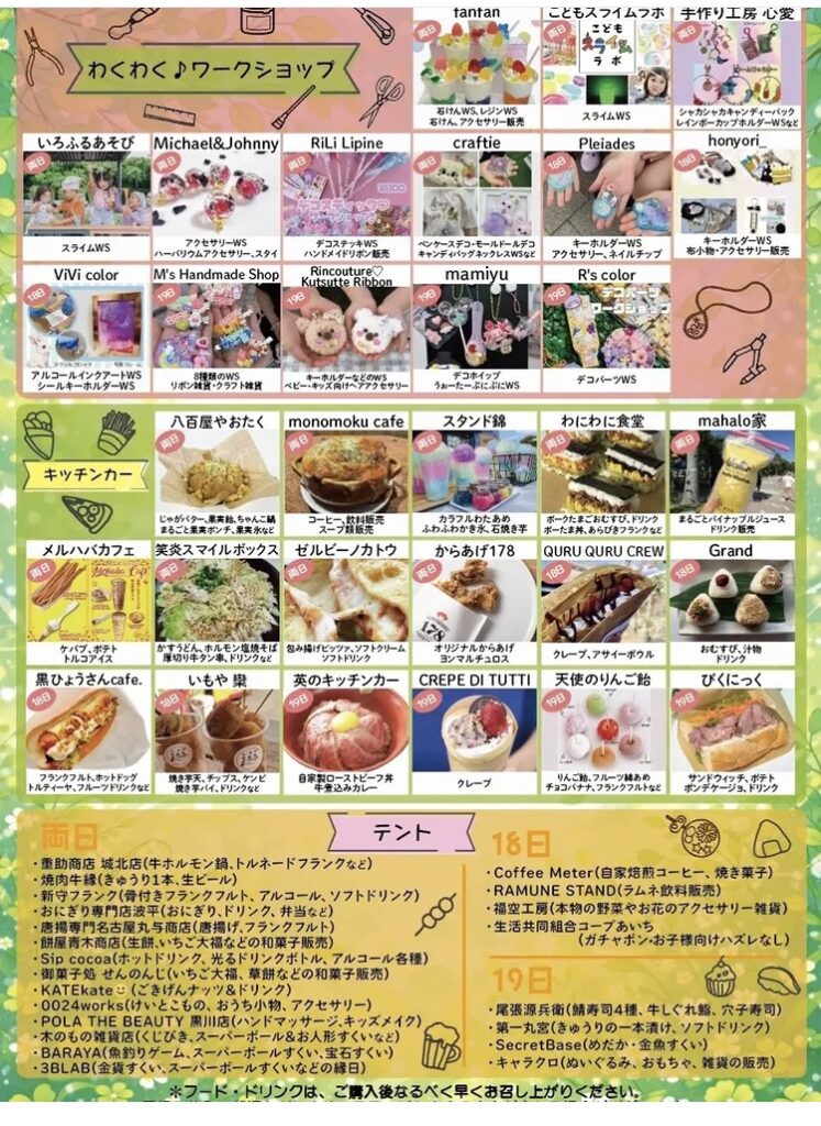 北区平手町の志賀公園にキッチンカーや飲食ブースが多数集結し、家族で楽しめるワークショップまで楽しめる2日間です。
