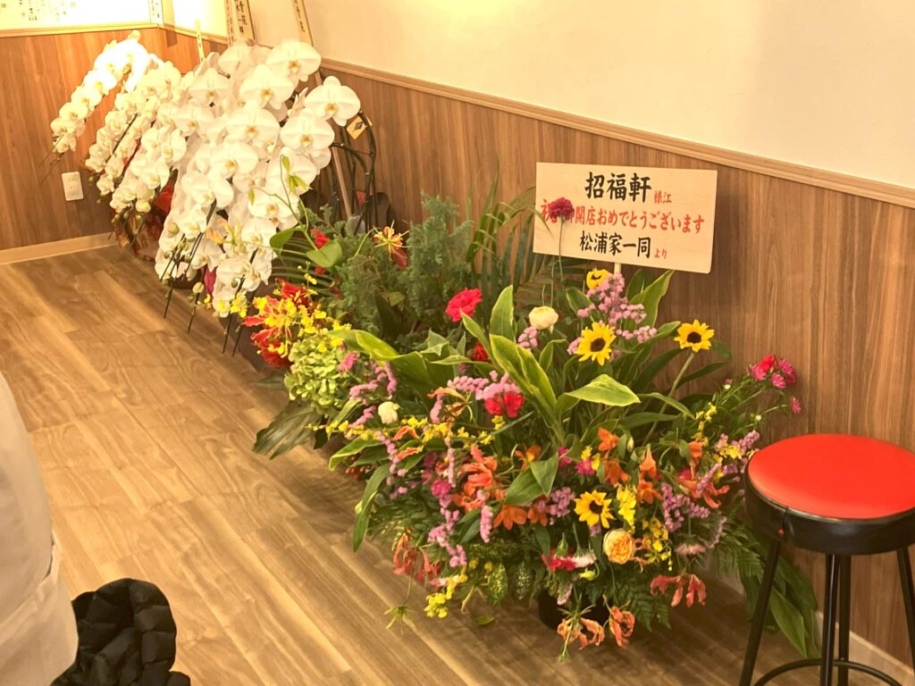 祝い花やメッセージが並び、長く待ち望まれてきた店であることが感じられました。