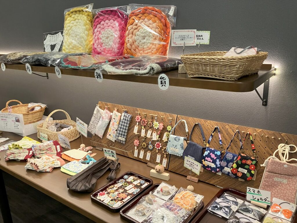 店内右手には、シュシュや布小物などのハンドメイド雑貨が並びます。